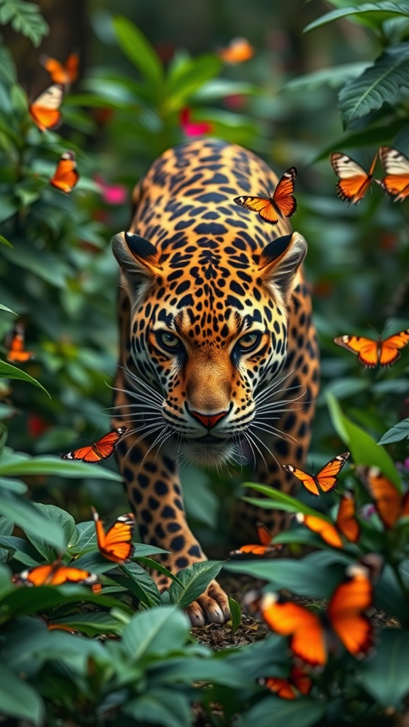 Jaguar prowling through the lush rainforest, adorned with vibrant butterflies, captured with a Canon EOS Rebel SL2, paired with an EF100mm f/2.8L Macro IS USM lens, at f/2.8, 100mm, 1/1000 shutter speed, ISO 100.