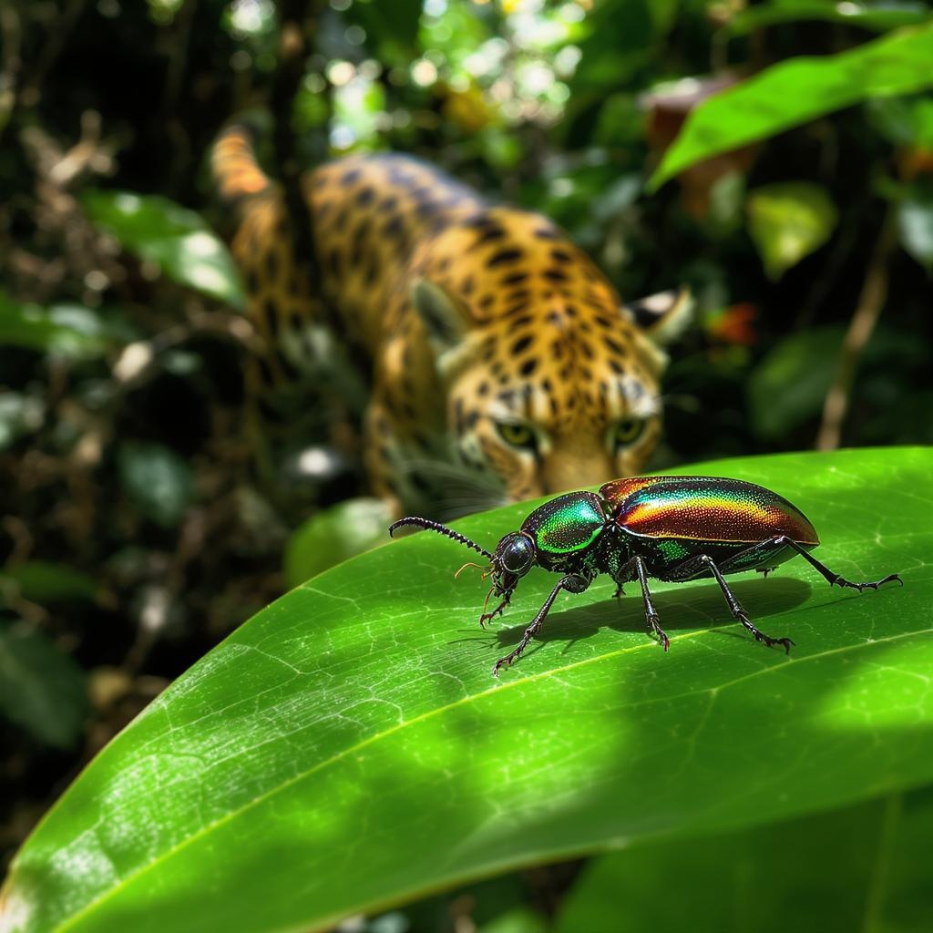 Jaguar prowls through lush rainforest undergrowth, vibrant beetle glistens on emerald leaf, captured with Canon EOS Rebel SL3, RF100mm, f/2.8, Macro IS USM ƒ/2.8, 100.0 mm, 1/800 100, play of light and shadow reveals nature's intricate dance.