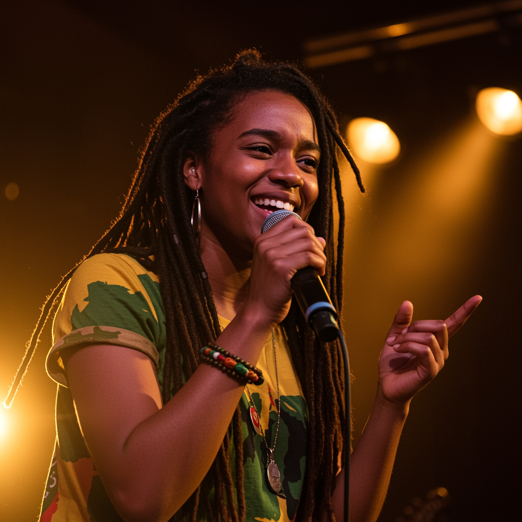 View this AI-generated image featuring jamaican singer songwriter with soulful rhythms and powerful lyrics transcending cultural boundaries to spread messages of love peace and unity through reggae music. Created using advanced AI technology, this image showcases creative visuals, AI artwork. Perfec