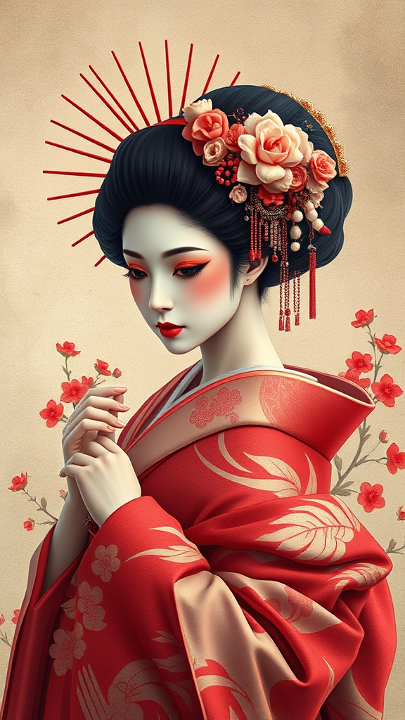 japan-inspired geisha enchanting artwork wallpaper, evoking joel robison's style with light ivory and deep crimson hues, samyang af 14mm f/2.8 rf lens effect, classical figurative realism touch, reminiscent of 500–1000 ce aesthetics, sculptural essence, subtle anime influence, aspect ratio 9:21, enhanced quality, higher stylization level.