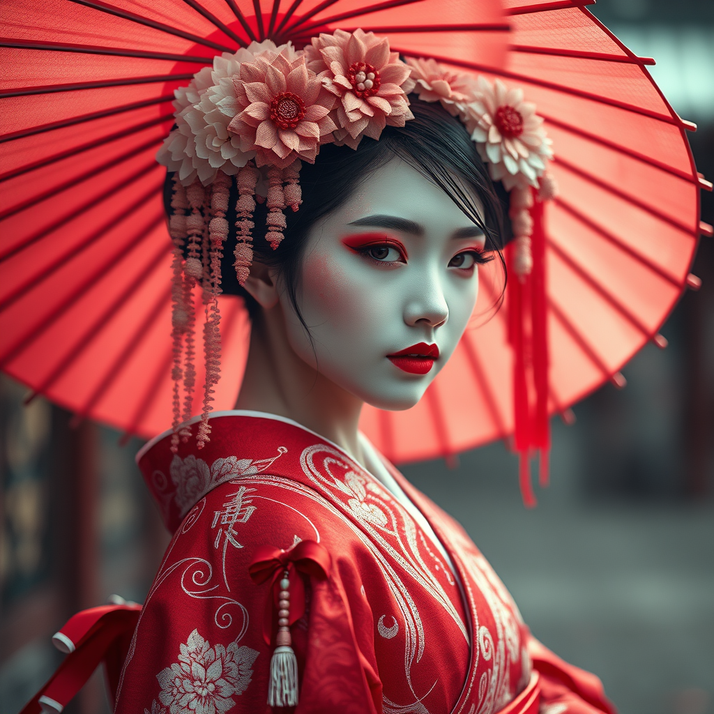 Japan-inspired geisha stunning visual scene, influenced by the artistic style of Joel Robison, featuring subtle interplay of ethereal white and deep crimson tones, captured through a Samyang AF 14mm f/2.8 RF lens, blending classical figurative realism with elements from 500–1000 CE, sculpted aesthetics, and a touch of anime influence. Aspect ratio 9:21, aiming for high quality and vibrancy in the depiction.