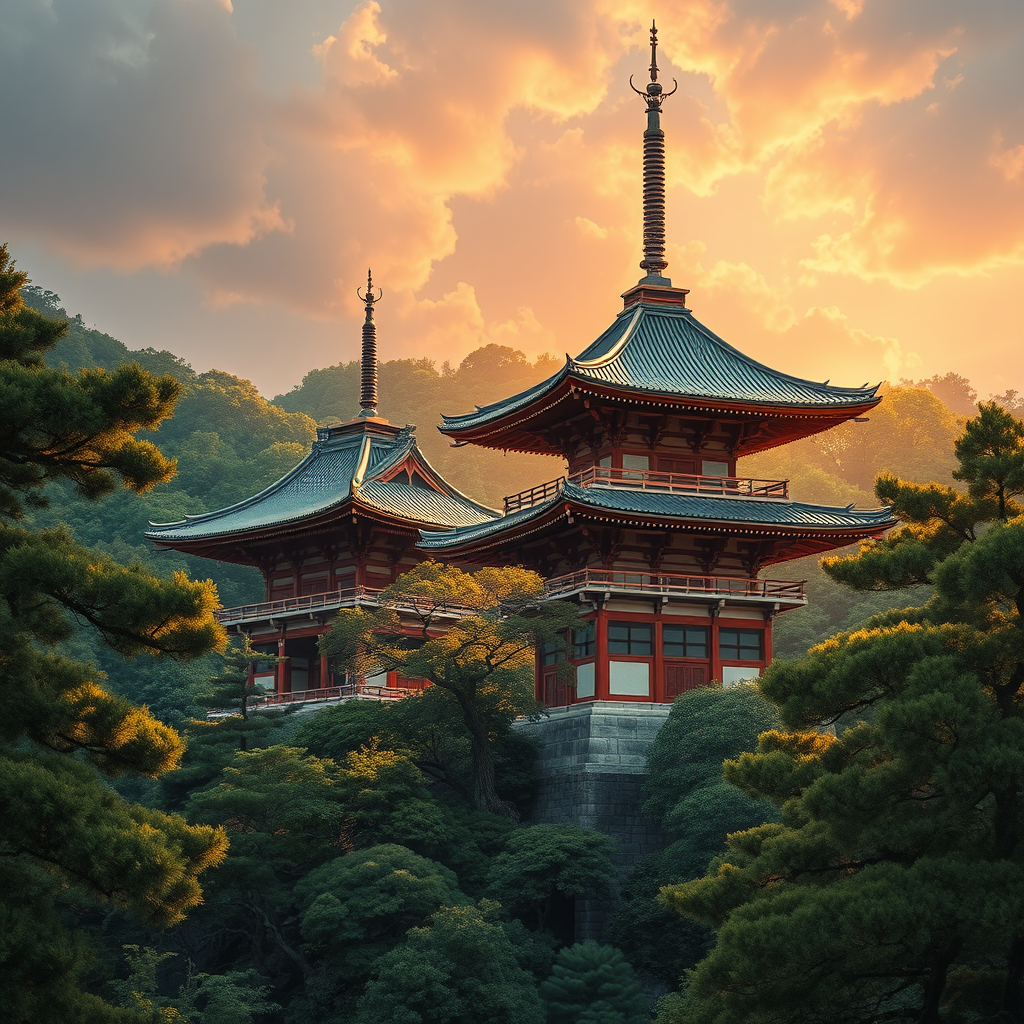 Japan temple scenery by Laurie Greasley featuring two majestic temples nestled amidst lush trees under ethereal fantasy lighting, with an emphasis on intricate details reminiscent of an artstation masterpiece, aspect ratio 2:1, with enhanced visual quality for a captivating depiction.
