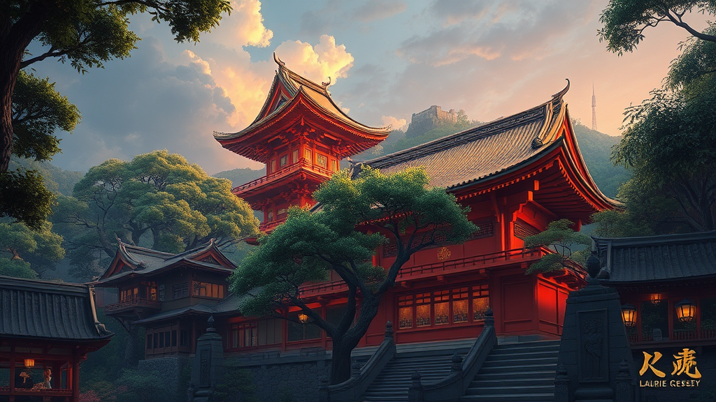 Japan temple scenery by Laurie Greasley featuring intricate details with lush trees and fantasy lighting, showcasing an exceptionally detailed style reminiscent of ArtStation, presented in a panoramic 2:1 aspect ratio and captured with twice the quality for visual richness.