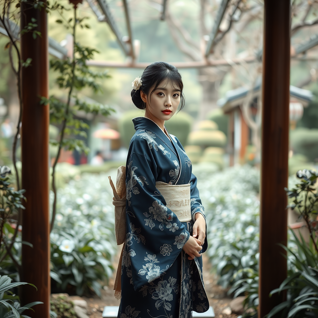 Japanese beauty in a navy and silver kimono adorned with delicate floral patterns, standing gracefully amidst a serene garden. The scene is captured in fine lines with medieval-inspired elegance, accented by dark silver and touches of light gold. Her presence exudes classic Hollywood glamour, reminiscent of the intricate artistry of Qian Xuan. Photographed with a Nikon D750, and a Samyang 14mm f/2.8 lens, the image incorporates the expressive and curvilinear style akin to Bella Kotak, blending ready-made fashion with timeless allure.