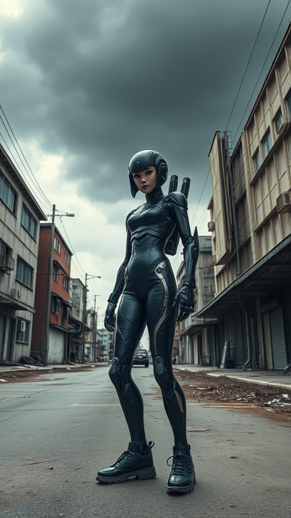 Japanese female android in futuristic cyberpunk attire stands alone on a deserted street surrounded by dilapidated buildings, the sky is a heavy overcast casting a gloomy shadow over the scene, the setting exudes a cinematic feel with intricate details in 32k resolution, the aspect ratio is 9:16, characterized by an expressive style and elements of dystopia subtly reimagined.