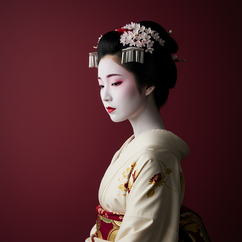 japanese geisha elegant art wallpaper, inspired by joel robison, featuring soft ivory and rich burgundy hues, captured with a samyang af 14mm f/2.8 lens, blending classical figurative realism with anime influences, reminiscent of the 500–1000 ce era, sculpted contours, ethereal and graceful essence, emphasizing a harmonious balance of form and color.