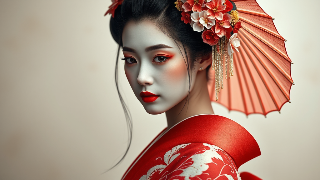 japanese geisha elegant portrait wallpaper, in the style of joel robison, soft ivory and rich crimson hues, utilizing samyang af 14mm f/2.8 rf lens, classical figurative realism, inspired by 500–1000 ce artifacts, delicately sculpted with anime influences, aspect ratio 9:21, enhanced quality, subtle artistic flair, vibrant details