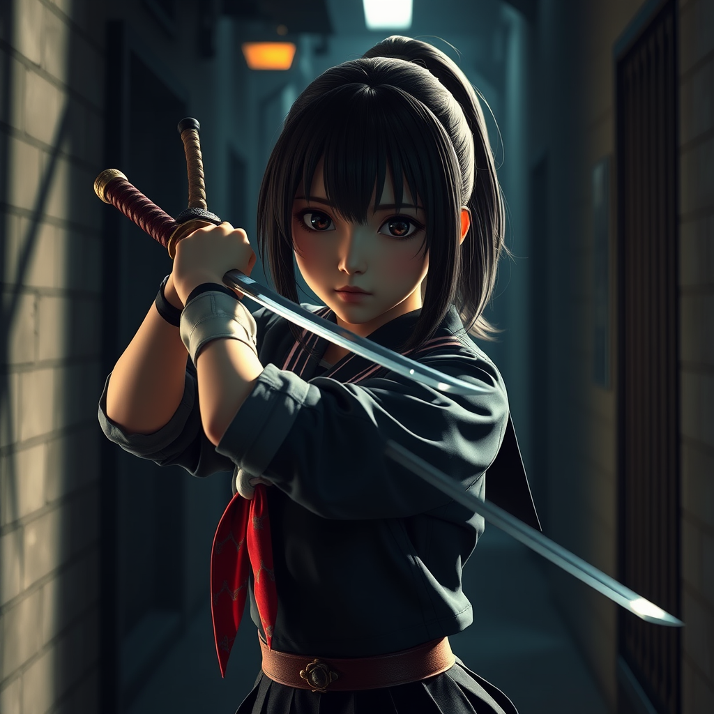 Japanese girl in school uniform wielding a katana in a shadowy alley, cinematic atmosphere, hyper-realistic 3D render, powered by Unreal Engine, ultra high definition, aspect ratio 9:16, infused with expressive style and subtle fantasy elements, lighting accentuating her determined expression, scene filled with a sense of mysterious anticipation.