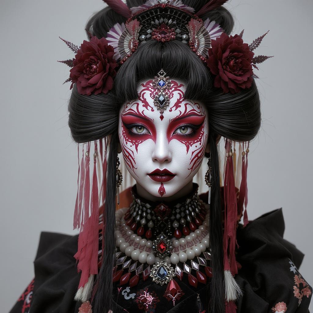 Japanese girl with a meticulously red and white painted face, embodying the essence of gothic futurism, featuring monochromatic symmetry and intricate, ornate embellishments. The image captures an eerily realistic quality, influenced by the aesthetic of Yup'ik art, utilizing photo-realistic techniques that highlight her porcelain-like complexion. The composition is harmonious, blending tradition with an avant-garde edge, showcasing a delicate yet bold visual narrative.