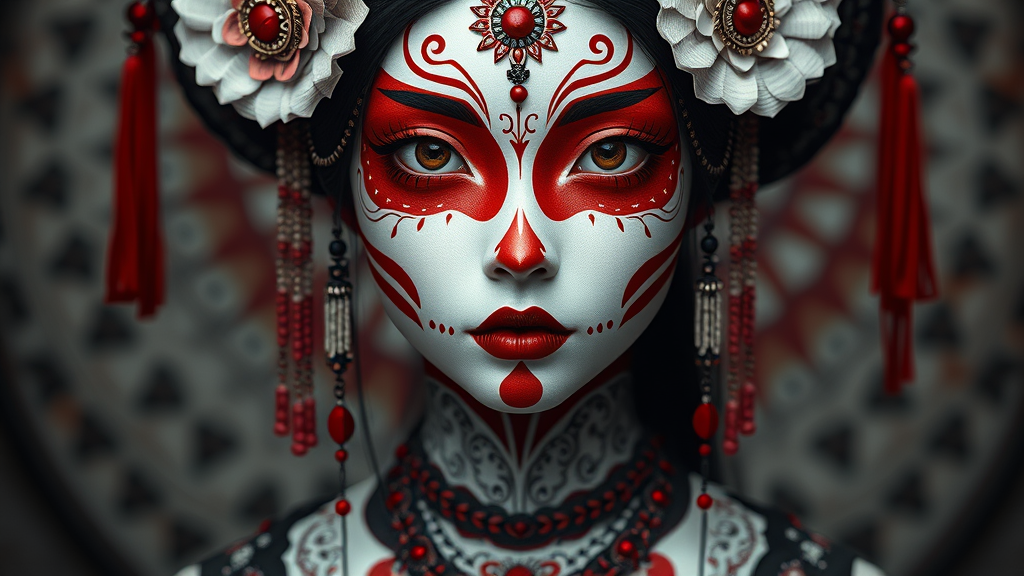Japanese girl with a red and white painted face, styled in gothic futurism with a monochromatic symmetry, adorned with intricate embellishments. The eerily realistic depiction incorporates elements of Yup'ik art, utilizing photo-realistic techniques to enhance the porcelain-like features. This fusion creates a striking and hauntingly beautiful image.