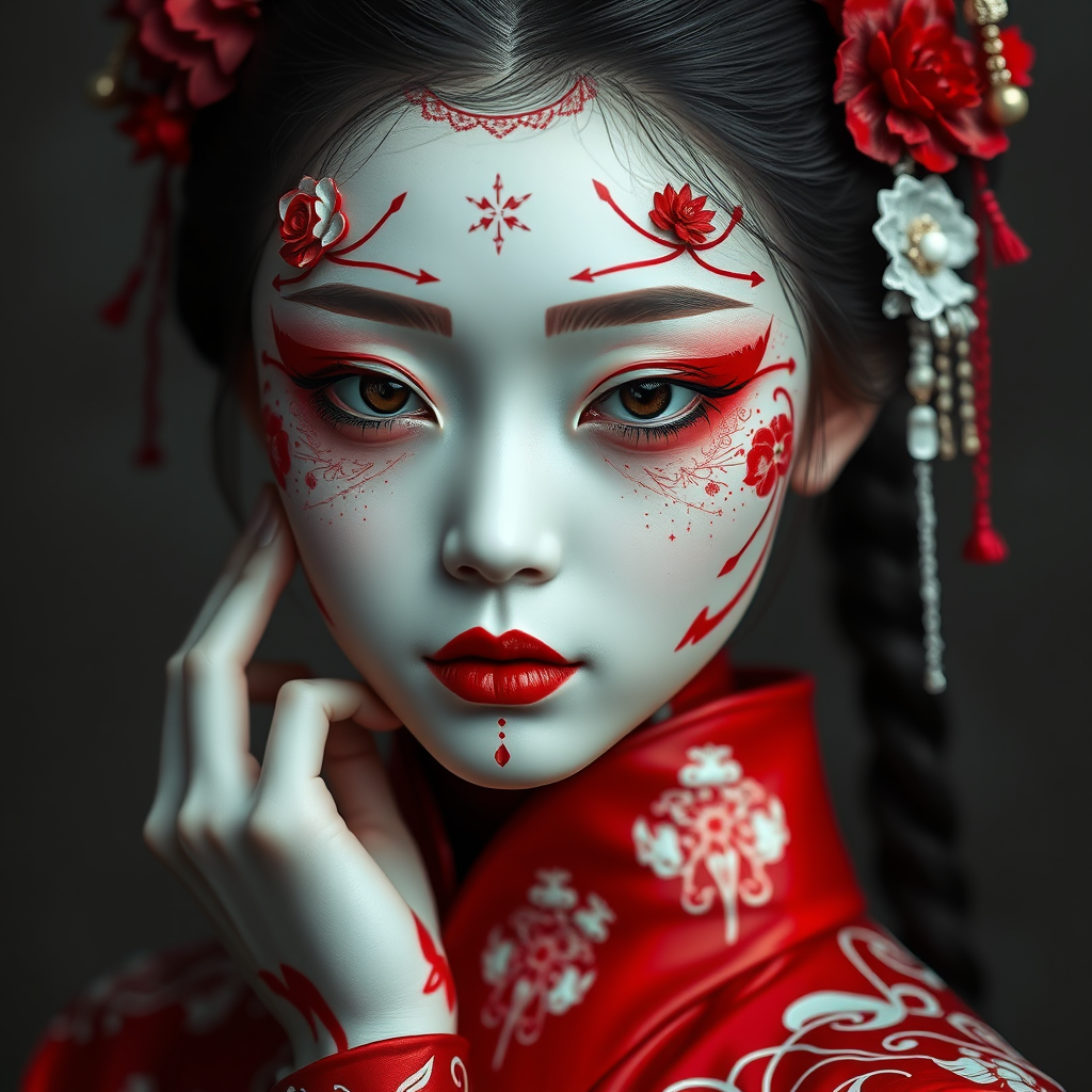 Japanese girl with an intricately painted red and white face, captured in the style of gothic futurism with monochromatic symmetry. With detailed embellishments adding depth, her appearance is eerily realistic, reminiscent of Yup'ik art, employing photo-realistic techniques. Her complexion resembles glazed porcelain, creating a blend of ethereal and futuristic beauty.