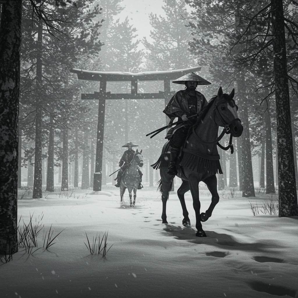 Japanese ink art, black and white, expansive panorama, Samurai galloping through a snowy woodland, captured with Cinematic flair, utilizing Unreal Engine 5, Editorial Photography infused with masterful Color Grading. Shot with a vintage 70mm lens, incorporating Depth of Field and Tilt Blur, optimal settings at Shutter Speed 1/1000 and F/22, balanced with 32k White Balance. Envisioned in Super-Resolution and Megapixel clarity, rendered in ProPhoto RGB and tailored for VR experience, evoking tall, epic visuals inspired by artgerm and alex ross. Illuminated through Halfrear and Backlight, blending Natural, Incandescent, and Optical Fiber lighting, casting a moody and cinematic aura. Features include Studio and Soft lighting, accentuated by Volumetric and Contre-Jour techniques, with dark and Accent Lighting. Advanced Global Illumination, Screen Space Global Illumination and Ray Tracing Global Illumination enrich the scene. Red Rim lighting and cool 45% color grading enhance Optics, Scattering, and Shadows. Shimmering effects with Ray Tracing Reflections and Lumen Reflections, supplemented by Screen Space Reflections, Diffraction Grading, and Chromatic Aberration. Incorporates GB Displacement, Scan Lines, and advanced Ray Tracing techniques like Ambient Occlusion, Anti-Aliasing, FKAA, TXAA, RTX, and SSAO. Features OpenGL-Shaders, GLSL-Shaders, refined through Post Processing and Post-Production, with Cel Shading, Tone Mapping, CGI, VFX, SFX for an insanely detailed and intricate, hypermaximalist touch. Ultimately elegant, hyper realistic, super detailed, capturing a dynamic centered pose with artistic photography flair.