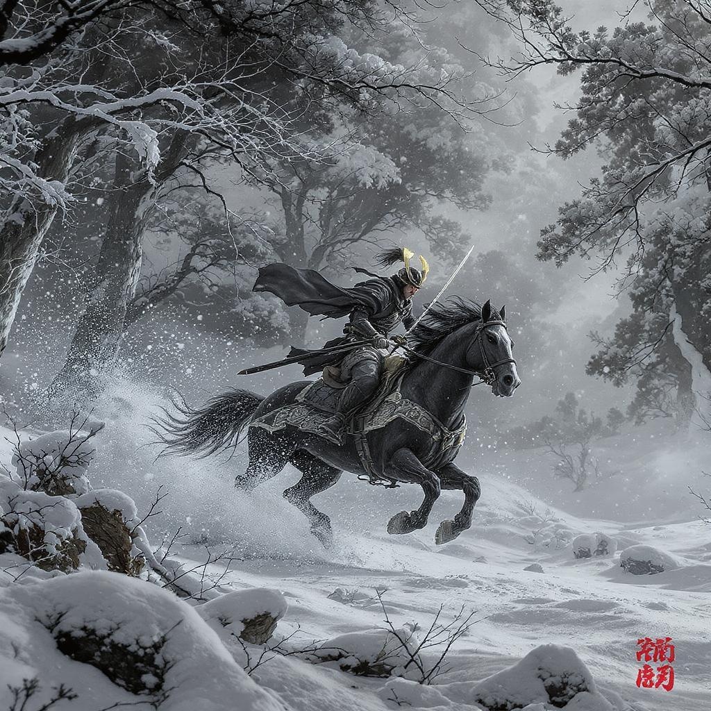Japanese ink art black and white panoramic view Samurai galloping through snowy forest captured with cinematic lighting Unreal Engine 5 rich cinematic color grading editorial photography shot using a 70mm lens with depth of field tilt blur precise shutter speed at 1/1000 and F/22 fine-tuned white balance at 32k achieving super-resolution and megapixel clarity leveraging ProPhoto RGB a VR experience with towering and epic qualities inspired by artgerm and alex ross featuring halfrear and backlighting set in natural lit incandescent with optical fiber moody atmosphere studio soft lighting combined with volumetric and contre-jour effects displaying dark accentuated details global illumination techniques applied screen space enhanced global illumination and ray traced lighting elements accented by red rim lighting cool 45% color grading harnessing optics scattering glowing shadowed rough and shimmering textures elaborate ray tracing reflections with lumen and screen space reflections diffraction grading and chromatic aberration incorporated into the scene using GB displacement scan lines ray traced ambient occlusion anti-aliasing FKAA TXAA RTX enhanced SSAO integrated shaders from OpenGL and GLSL post-processing and post-production elements including cel shading tone mapping VFX and SFX to create an insanely detailed and intricate hypermaximalist composition elegantly hyper-realistic with super detailed and dynamic pose centered in the photography.