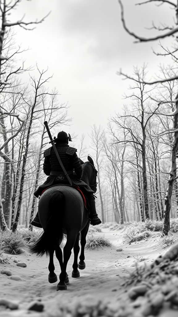 Japanese ink art in a black and white, panoramic landscape, featuring a Samurai riding a horse through a serene snowy forest. The scene captures cinematic lighting reminiscent of Unreal Engine 5 capabilities, highlighting editorial photography with a 70mm lens clarity. There's a profound depth of field, enhanced by tilt blur effects and a precise shutter speed of 1/1000 at an aperture of F/22, set against an optimal white balance mirroring 32k super-resolution. Framed in megapixel perfection using ProPhoto RGB, the VR view is tall and striking. Inspired by the styles of Artgerm and Alex Ross, the Samurai stands central in a dynamic pose with halfrear and backlighting accentuating the scene. The natural lighting combines with incandescent and optical fiber to create moody and soft tones. Volumetric contre-jour effects, complemented by global illumination techniques such as ray tracing and screen space reflections, cast intricate shadows and shimmering highlights. Red rim light adds a subtle cool color grading infusion at 45%. Attention to detail in scattering, glowing effects, and rough texturing is emphasized. Advanced CGI and VFX technology such as ray traced reflections, diffraction grading, and chromatic aberration deliver an ultra-realistic and hyper-detailed composition—integrating shaders, post-processing techniques, and an array of openGL-shaders. Tone mapping, cel shading effects, and RTX enhancements ensure this hypermaximalist scene remains dynamic and elegant, achieved through comprehensive post-production.