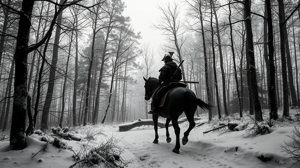 Japanese ink art inspired, capturing a black and white panoramic vista of a Samurai on horseback navigating a serene snowy forest. The scene is illuminated with cinematic, moody lighting akin to Unreal Engine 5's capabilities, evoking a sense of dynamic realism. This editorial-style photograph employs a 70mm lens, accentuating depth of field with a shutter speed of 1/1000 and F/22 aperture. The environment is tuned to a 32k white balance with super-resolution, showcasing intricate megapixel clarity within the ProPhoto RGB spectrum. A stunning blend of VR techniques merged with the tall, epic artistry reminiscent of creators like Artgerm and Alex Ross, captures the halfrear lighting beautifully. Natural and incandescent lights interplay with optical fiber and volumetric effects, creating a moody, cinematic atmosphere. Backlit with subtle red rim lighting and cool color grading at 45%, the composition plays with optics, scattering, and shimmering shadows, enhancing the rough yet elegantly detailed scene. Advanced lighting and reflection techniques, such as Ray Tracing Global Illumination, Global Illumination, and Screen Space Reflections, bring out rich textures and vivid contrast. The detailed photorealistic elements are complemented by CGI and VFX enhancements, rendered with advanced ray tracing, ambient occlusion, and anti-aliasing features. Shaders and OpenGL techniques support the post-processing phase, introducing cel shading and tone mapping for an additional layer of hyper-realism. This vision results in an impossibly detailed, photorealistic capture of a dynamic pose, centered within the frame, embodying the elegance and complexity of Japanese ink art within a modern photographic narrative.