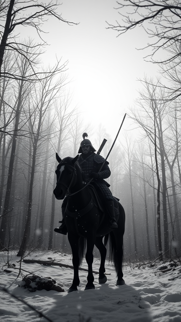 Japanese ink art style, panoramic black and white vista of a Samurai on horseback in a snowy forest. The scene is captured with cinematic lighting effects using advanced Unreal Engine 5 techniques, showcasing editorial photography aesthetics. Shot with a 70mm lens, features include deep depth of field, tilt blur, and a shutter speed of 1/1000 with f/22 aperture settings for sharp focus. The color grading leans cool, at 45%, with an emphasis on moody incandescent and studio lighting, enhanced by volumetric and global illumination. The backlit composition creates a surreal scene with elements of ray tracing reflections and ambient occlusion. Details include shimmering textures, glowing accents, and chromatic aberration effects. Advanced post-processing techniques like cel shading and tone mapping are used to achieve a hyper-realistic, super-detailed image with vibrant optical effects and shaders. This intricately detailed, dynamic, and elegant shot captures the dramatic essence of the scene with a hypermaximalist approach, centered composition, and an epic, timeless atmosphere.