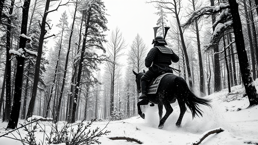 Japanese ink-inspired art in black and white presents a panoramic view of a Samurai riding majestically through a snowy forest. Cinematic lighting akin to Unreal Engine 5 breathes life into the scene, capturing an editorial photography essence with a 70mm lens. The depth of field is pronounced with the slight tilt blur, capturing motion at a shutter speed of 1/1000, with a crisp F/22 aperture and a pure 32k white balance. This hyper-realistic and super detailed portrayal, echoing the styles of Artgerm and Alex Ross, is illuminated by a combination of natural and studio lighting including half-rear, backlight, and accent incandescent sources. The scene is imbued with a moody atmosphere, using volumetric, contre-jour, and global illumination techniques. Red rim light subtly outlines the forms, while cool color grading at a balanced 45% enhances the overall composition. Advanced optics with scattering effects enrich the image craft, complemented by shimmering reflections and ray-traced marginals for depth and realism. Rendering optimized for OpenGL with advanced shading techniques, post-processing effects like cel shading, tone mapping, and anti-aliasing refine this CGI marvel—an intricate, hypermaximalist depiction of elegance, with a dynamic pose of the Samurai centered in this epic narrative photograph.