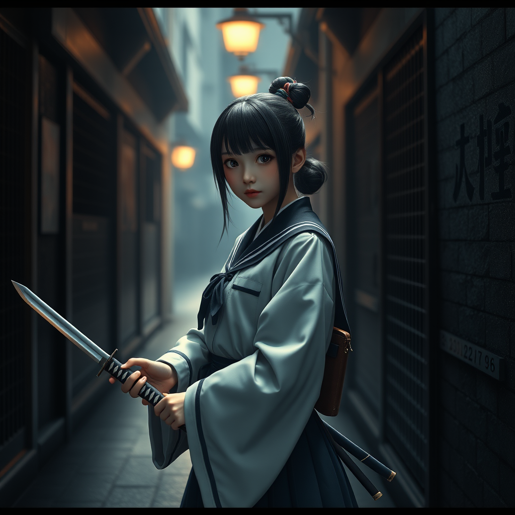 Japanese junior high school girl, wearing a traditional school uniform, holding a katana in a shadowy alley, cinematic ambiance, realistic 3D rendering, enhanced with Unreal Engine, ultra-high resolution, aspect ratio 9:16, vivid and expressive style, moody lighting and intricate details.