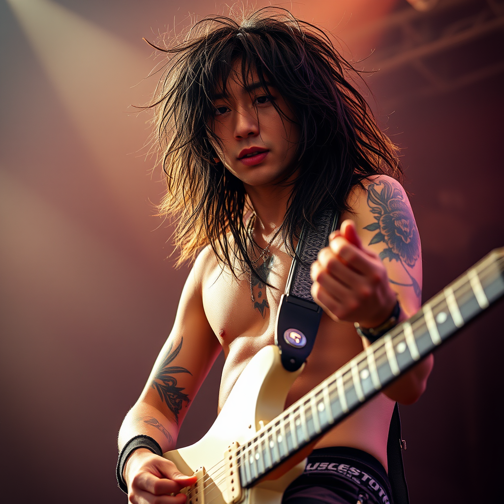Japanese rockstar on stage, electric guitar, long messy hair, tattoos, full body, cinematic lighting, soft diffused light, detailed lifelike skin, realistic and hyper-detailed, sharp focus, shallow depth of field, real shadows, captured in 8k resolution, text elements, close-up and dynamically cropped, vibrant energy, high contrast, engaging facial expression, captivating stage presence, reflective guitar surface, intense atmosphere, dynamic pose, seamlessly blends realism with artistic flair.