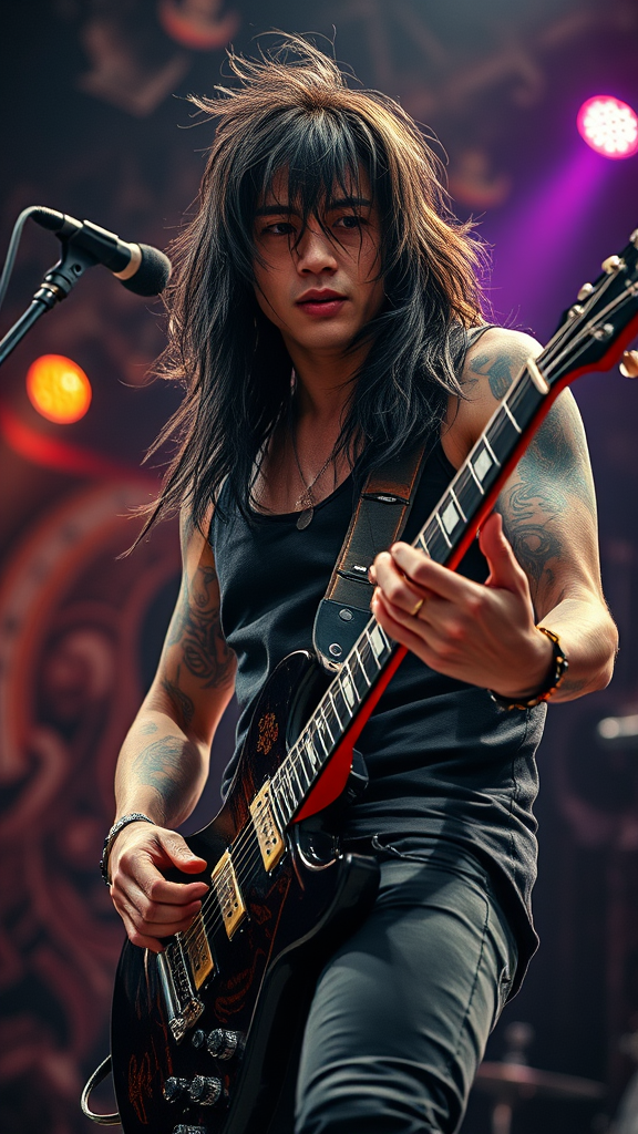 Japanese rockstar on stage with electric guitar, long edgy hair, visible tattoos; full body shot with cinematic lighting, soft diffused lights, rich cinematic textures; focus on detailed and realistic skin, hyperrealism effects, 8k resolution reveal sharp features with natural shadows; atmosphere with mild cinematic noise; background slightly out of focus for depth; ensure model is in sharp focus, maintaining photo realism with detailed close-up capturing true essence; embrace minute imperfections that tell a story; avoid any abnormal features or distortions, strive for authenticity in portrayal; maintain character's expressive presence and dynamic posture while playing the guitar.