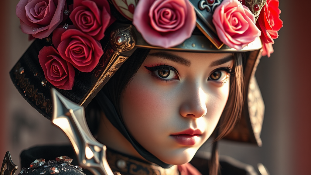 Japanese samurai girl with an aura of mystery, her helmet elegantly adorned with vibrant roses in shades of pink and red, surrounded by shimmering crystals that catch the light. Her armor exudes a magical essence, reflecting her ethereal strength and grace. The scene is captured in a close angle with ultra-realistic detail, as if photographed under pristine lighting conditions, highlighting every intricate feature and creating a captivating portrait that merges fantasy with realism.