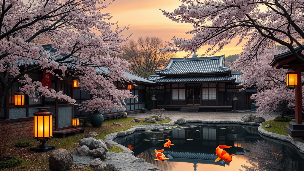 Japanese sanctuary, CutAway-500 style, with an aspect ratio of 2:3 and quality setting 2, featuring serene traditional architecture nestled among cherry blossom trees, gently cascading lanterns illuminating a tranquil path, serene koi ponds reflecting the golden hues of a setting sun, and subtle whispers of incense drifting through the air.