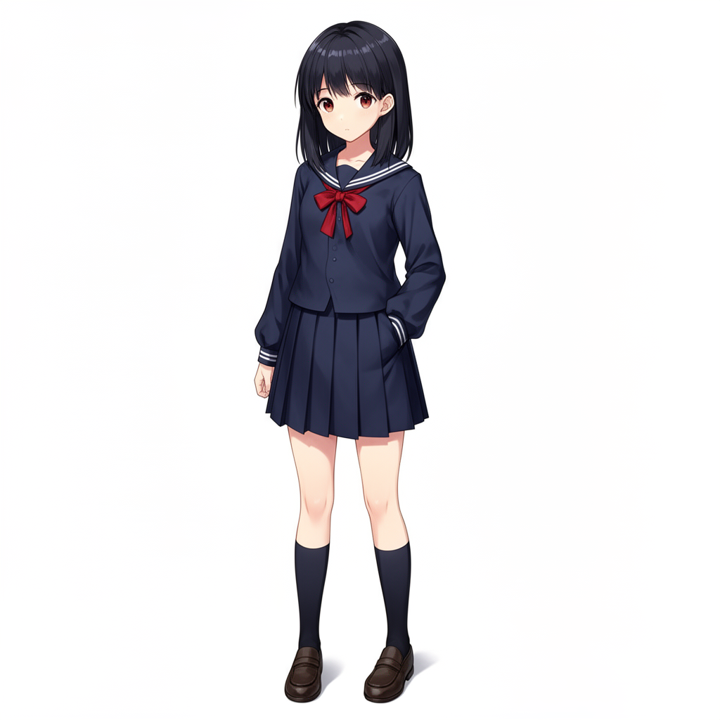 A young Japanese schoolgirl stands confidently in a dark blue sailor uniform with a red bow. Her short black hair and brown eyes complete the classic anime-inspired character design.
