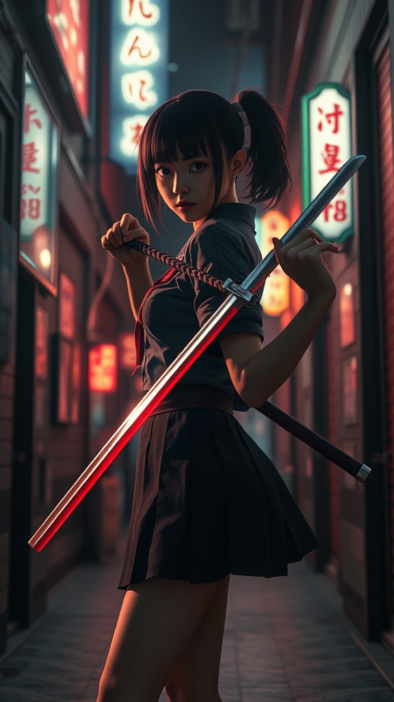 Japanese schoolgirl wielding a sleek katana, poised in a shadowy alleyway, illuminated by the faint glow of neon signs, cinematic atmosphere, detailed 3D rendering using cutting-edge technology, high-resolution 32k quality, portrait mode, stylized with expressive details and dynamic lighting settings, evoking an intense and mysterious vibe, surreal yet lifelike composition.