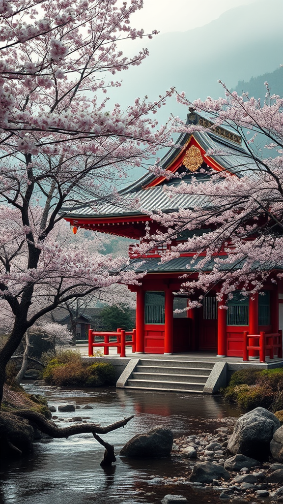 Japanese shrine nestled among serene cherry blossom trees, intricately detailed architecture with ornate wooden carvings and vibrant red gates, gentle stream flowing nearby reflecting the soft ambient light, misty mountains in the background adding depth, calm and tranquil atmosphere, emphasized focus on harmony and balance, --ar 2:3 --q 2.