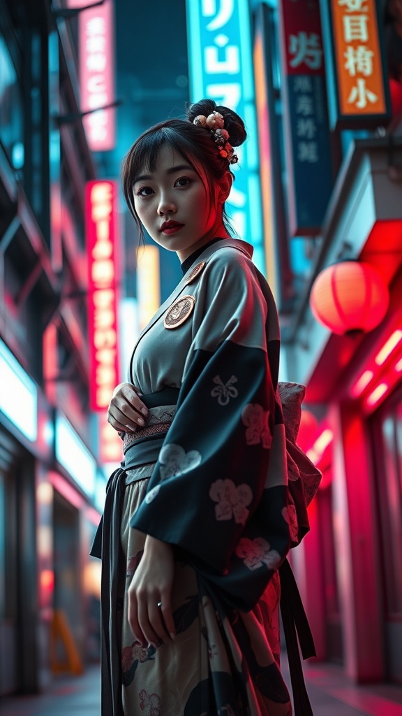 A 30-year-old Japanese woman exuding timeless beauty, set in an atompunk world. Her whole body is elegantly presented, captured from a high angle in a cinematic shot. The composition is perfectly centered, showcasing her in an environment filled with epic level details. She stands confidently in a futuristic urban setting, surrounded by sleek metallic architecture and vibrant neon lights that reflect off her attire. Her outfit is a stylish blend of modern and traditional elements, excluding traditional kimonos, highlighting her individuality and the fusion of cultures. The intricate details of her hairstyle and accessories complement the overall aesthetic, embodying the harmonious blend of historical elegance and futuristic innovation.