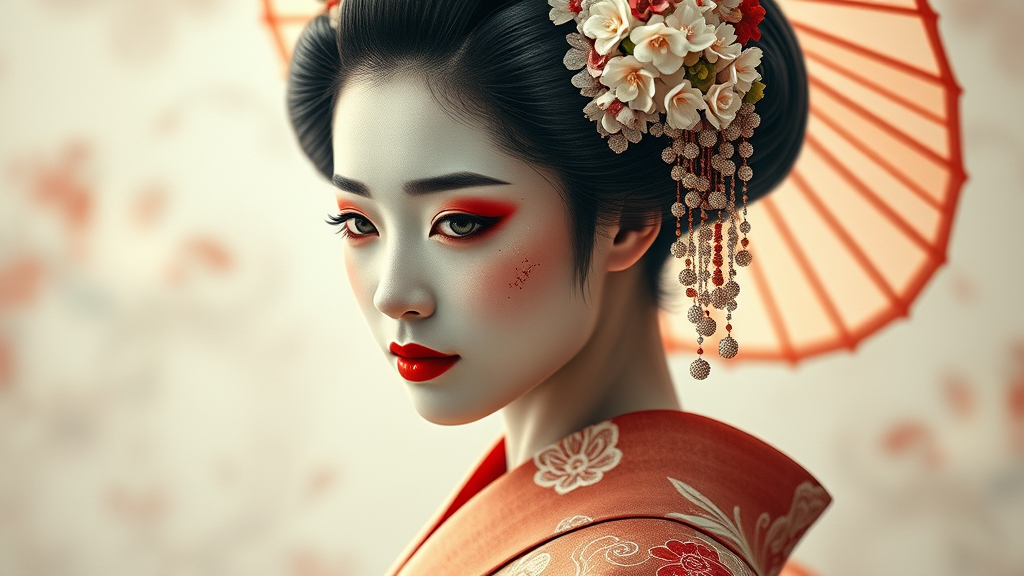 Japanesian geisha enchanting portrait wallpaper, inspired by the style of Joel Robison, blending ethereal white and rich dark crimson tones, captured through the lens of a Samyang AF 14mm f/2.8 RF, evoking classical figurative realism with an ancient 500–1000 CE aesthetic, sculpted with influences of anime artistry.