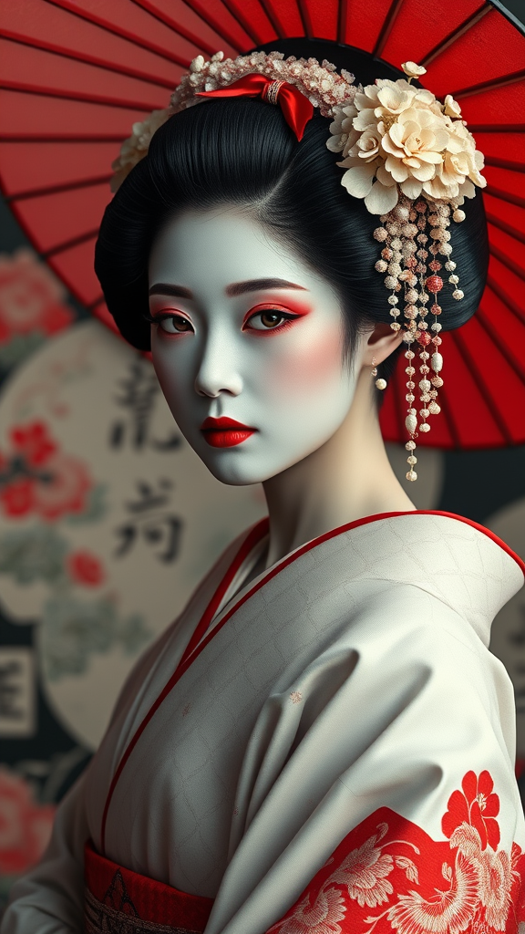 japanesian geisha stunning visual art, inspired by joel robison, featuring light ivory and deep crimson accents, depicted through a samyang af 14mm f/2.8 lens perspective, classical figurative realism infused with anime influence from 500–1000 ce, sculptural elements evident, elongated composition in 9:21 aspect ratio, enhanced quality level 2, with a subtle intensity setting of 750 version 5.1, making slight artistic variations on the initial inspiration.