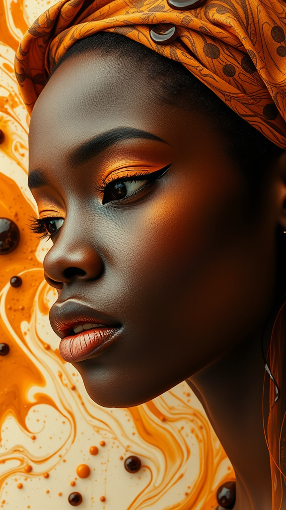 Java indulgence surrealism, pop color splashes, deep amber and ivory hues, flowing paint effect, afrofuturistic influence, lifelike portraiture, liquid dynamics --aspect 8:11 --saturation 750.