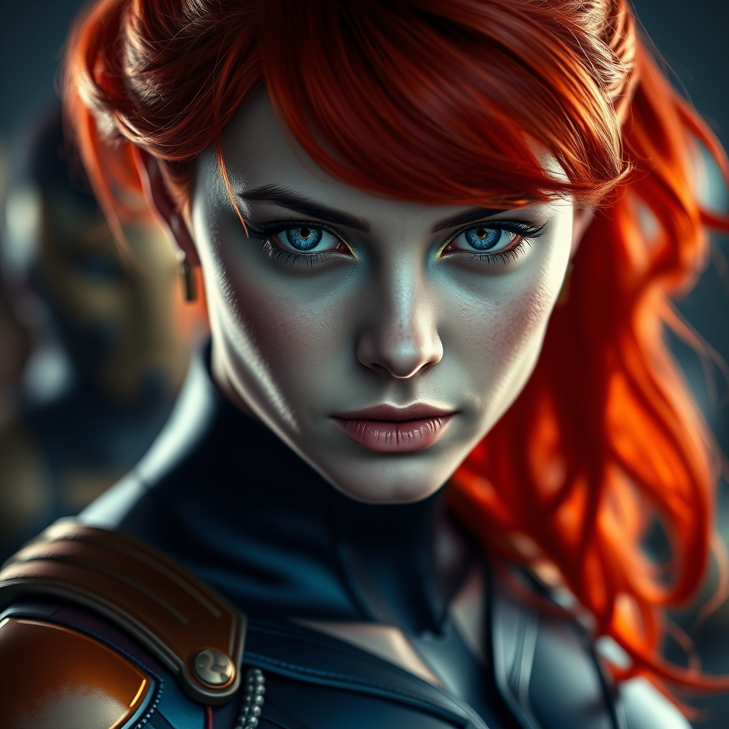 Jean Grey-inspired character, young female, part of a superhero team, captivating gaze, captured in portrait style, vivid photography, lifelike texture, ultra-realistic, high-resolution, intricate details, full body composition, vibrant RAW color artistry, compelling presence, soft balanced lighting, minimal depth of field, crisp and clear focus, cinematic and hyperrealistic presentation. Avoid characteristics like low resolution, text, distortion, cropping errors, poor quality, disturbing elements, anatomical inaccuracies, and digital artifacts. Emphasize elegance and realism without extraneous or exaggerated features.