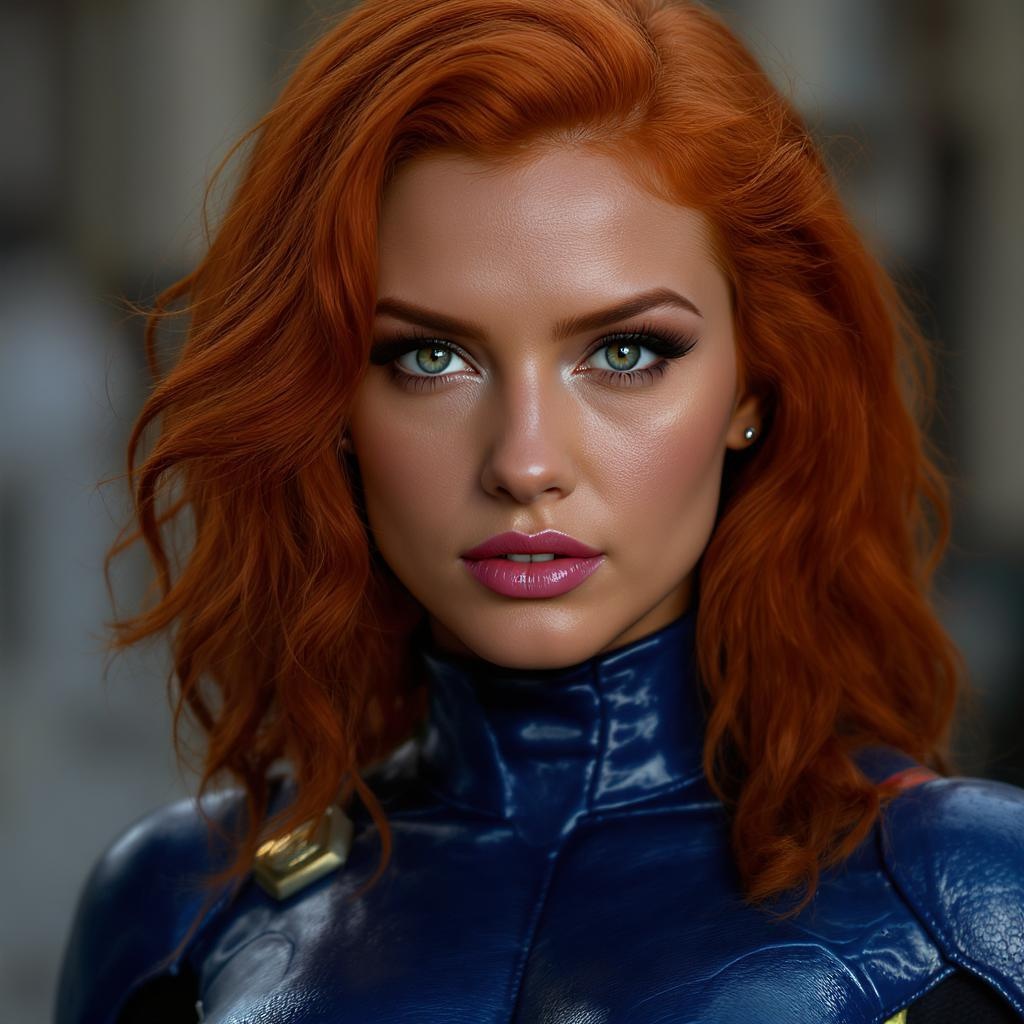 Jean Grey inspired character, youthful female, from X-Men lore, engaging with viewer, close-up, portrait photography, detailed and realistic skin texture, photo-realistic, high resolution 8k imagery, intricately detailed, full-length composition, vivid RAW color artwork, striking gaze, gently diffused lighting, shallow depth of field, crisp focus, cinematic hyperrealism, enhanced lighting, avoiding low quality features such as text errors, cropping issues, worst quality, duplication, deformation, proportion inaccuracies, unwanted mutations, blurry elements, or digital artifacts.