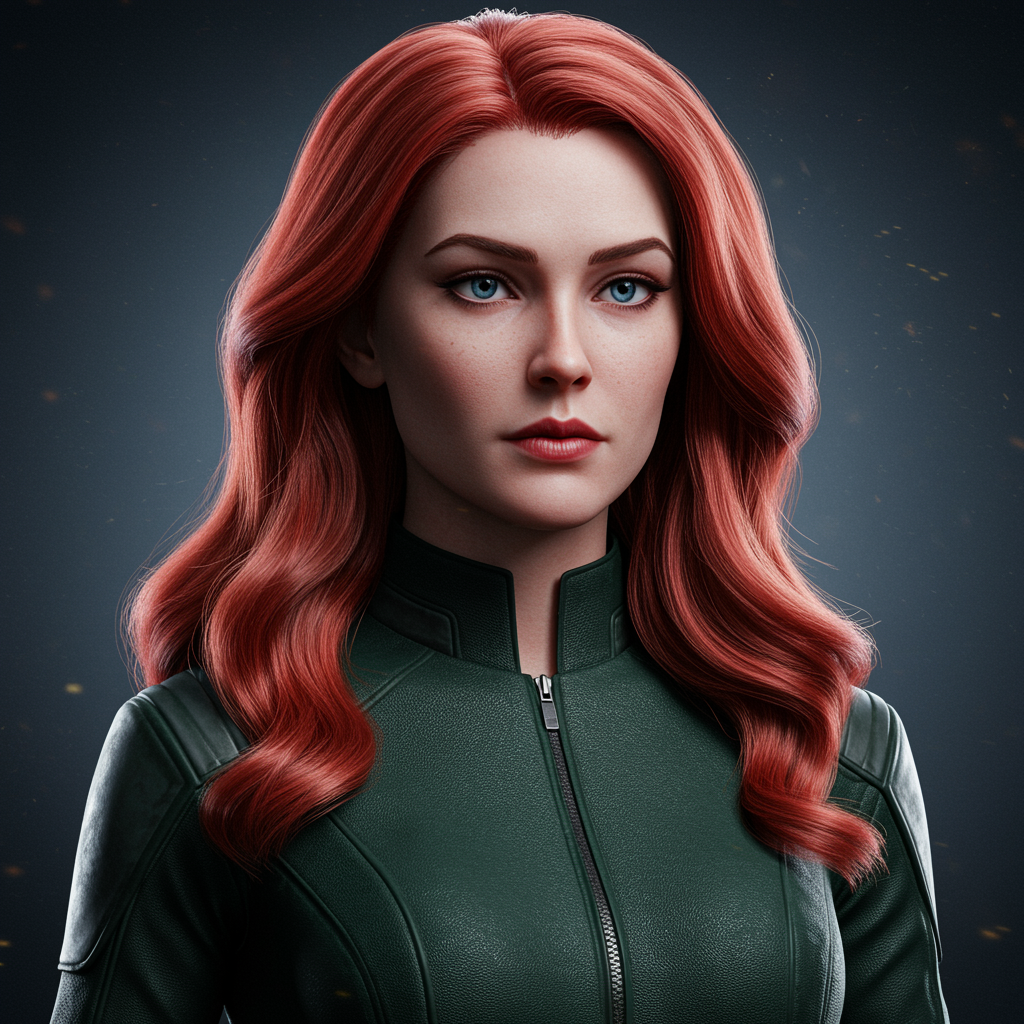 Jean Grey, young female, X-Men, facing the viewer in a portrait style, capturing a realistic and detailed skin texture with a highly photo-realistic finish, displayed in 8k resolution. Full-length frame showcasing high detail with RAW color art, complemented by diffused soft lighting creating a shallow depth of field and sharp focus. Emphasizing hyperrealism with cinematic lighting. The image excludes any elements of low resolution, text errors, cropping issues, low quality, jpeg artifacts, and unattractive or duplicate features. Ensures no morbid or mutilated characteristics, keeping everything in-frame with anatomically correct and proportionate attributes. No extra limbs, fused or excess fingers, distorted or poorly drawn features. Avoids missing, mutated, or malformed limbs, long necks, or any signs of artistic flaws like watermarks or signatures.