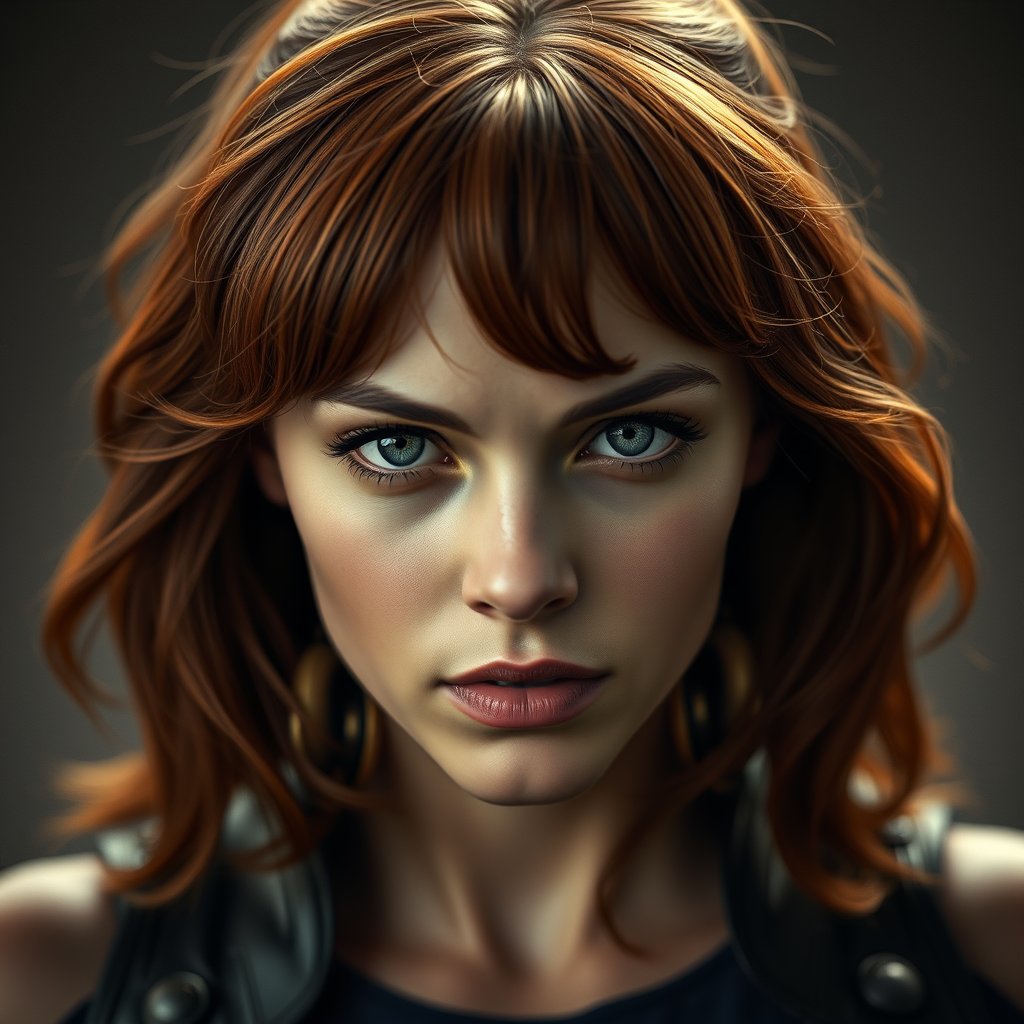 Jean Grey, young female, X-Men, gazing at viewer, portrait, photography, detailed skin, lifelike, ultra-realistic, 8k resolution, highly detailed, full-length perspective, high detail RAW color, striking features, soft diffused lighting, shallow depth of field, sharp clarity, hyperrealism, dramatic cinematic lighting, textural complexity, jpg distortions, unattractive, repetitive, unsettling, altered, distorted, poorly illustrated features, anatomical inaccuracies, unbalanced proportions, redundant limbs, unusual facial replication, distorted structure, unfocused, dry appearance, flawed anatomy, skewed proportions, extra appendages, distorted visage, disproportionate form, malformed extremities, lack of limbs, fused digits, excessive digits, extended neck, username, watermark, signature.