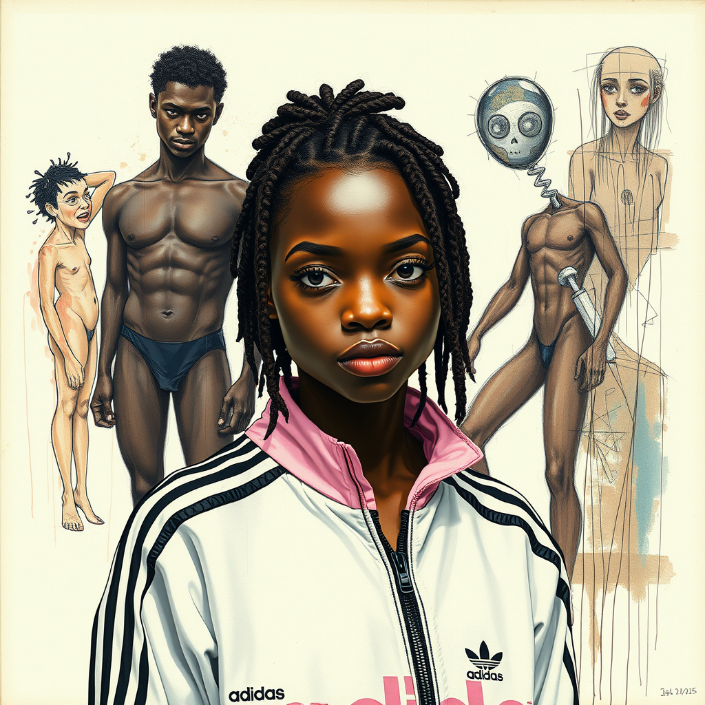 Jean Michel Basquiat inspired a cyborg girl in an Adidas tracksuit, exuding a sporty and affluent 1980s vibe captured through vintage photography. Her surroundings depict a naked black man reminiscent of Manet's style, blended with elements of cartoon, sketch, and abstract art. The scene embraces intentional imperfections and a raw quality, merging distinct artistic expressions into a single, vibrant composition.