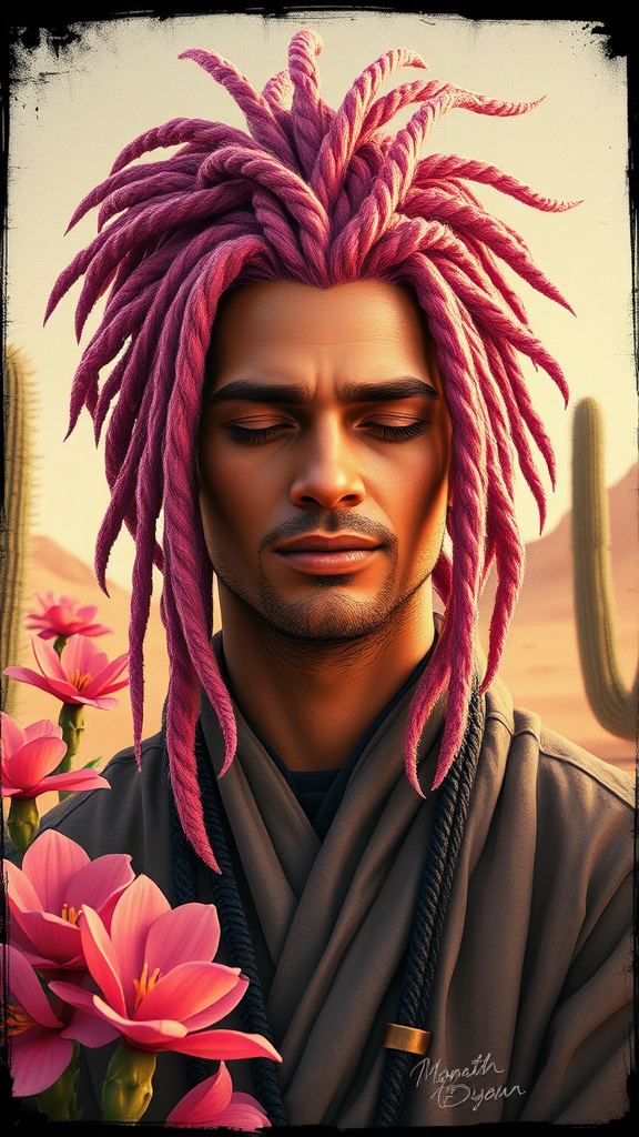 Jedi master with wild pink dreadlocks in serene contemplation, peaceful expression, surrounded by vibrant desert flora, emitting a gentle aura of the Force, intricate 3D illustration with realistic face details, explicit film grain, varied texture, mixed media, antique frame, manipulating reality, flirtatious smile, conflicted spiritual state, vacant background, isolated, monochromatic, intricately patterned, shrouded in a mystical glow