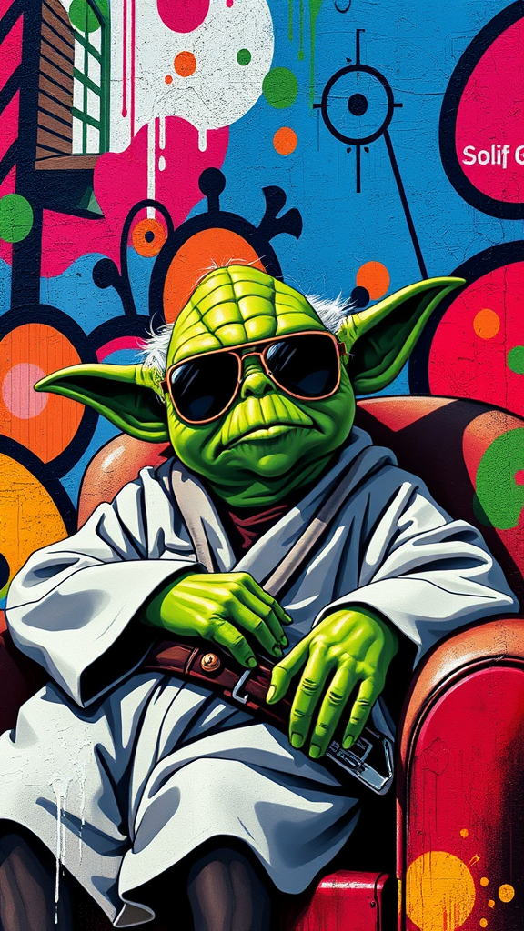 Jedi master Yoda lounging with stylish sunglasses, surrounded by vibrant street art full of bold colors and abstract shapes.