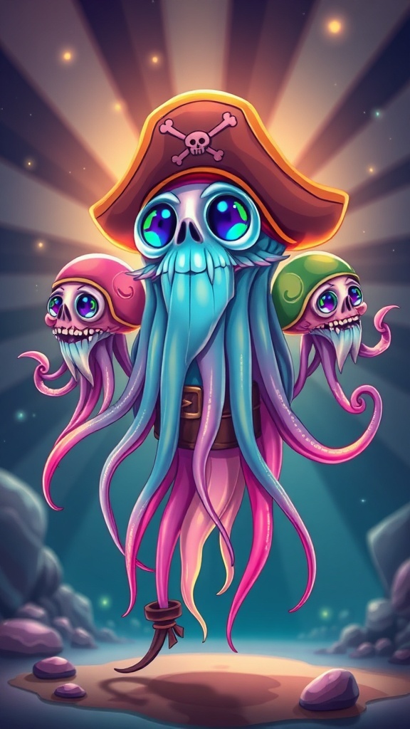 A whimsical jellyfish pirate with human-like features, standing proudly in a character portrait, illuminated from behind by enchanting light rays. This highly detailed creation captures a sense of adventure and mischief, trending on art platforms for its unique blend of cartoon and vector art style. The jellyfish sports multiple vibrant and expressive heads, each revealing a distinct personality, adorned in pirate attire. Its body, semi-transparent and ethereal, pulsates with colorful hues. With oceanic elements subtly integrated into the design, the scene is brought to life through the dynamic composition and imaginative distortions, embodying the spirit of a sea-faring swashbuckler.