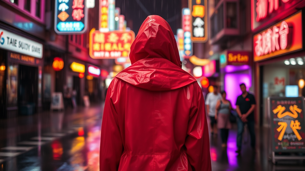 Jessica Alba stands facing away, draped in a vibrant coral raincoat under the drizzling rain. It's nighttime, and the neon lights cast colorful reflections across wet surfaces. Behind her, the bustling streets of Chinatown are alive with glowing signs in a myriad of hues, creating an atmosphere of urban mystery and allure.