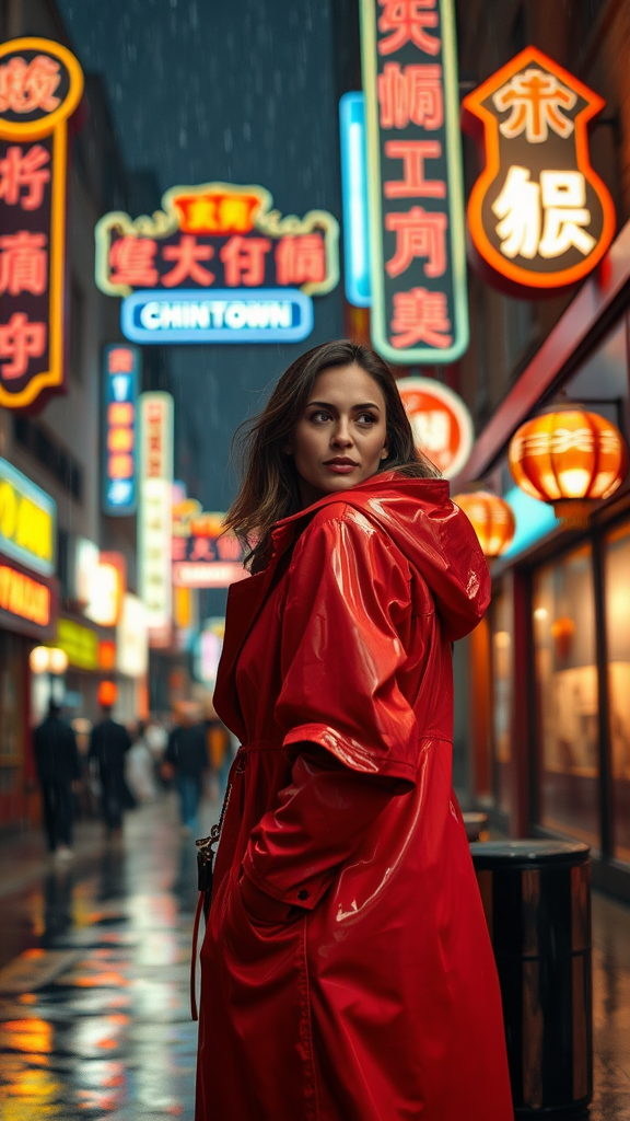 Jessica Alba stands in a vibrant coral raincoat, her gaze directed away from the camera, surrounded by the gentle patter of rain under the night sky. The illuminated glow of neon signs casts colorful reflections around her, with the bustling energy of Chinatown creating a lively backdrop. The scene captures a sense of mystery and allure against the atmospheric urban setting.