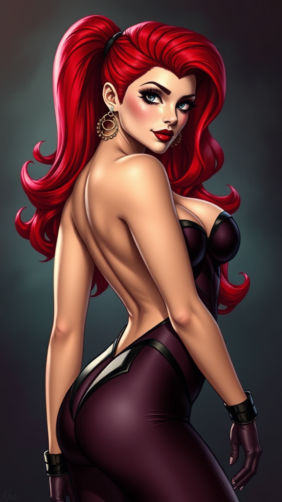 Jessica Rabbit-inspired character, captivating beauty with a magnetic presence, toned physique, elegant silhouette, unique contours, full-body composition, dramatic eye makeup, depicted in the artistic style reminiscent of Jessica Drossin, capturing an essence of intrigue and allure, with a harmonious blend of detail and grace, maintaining an artistic approach that highlights both character and style.