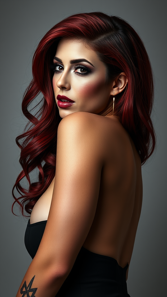 Jessica Rabbit inspired stunning and charismatic woman, possessing an athletic physique and mesmerizing curves, unique and captivating silhouette, full-length portrait, dramatic dark eye makeup, in the artistic style similar to Jessica Drossin, --ar 51:91.
