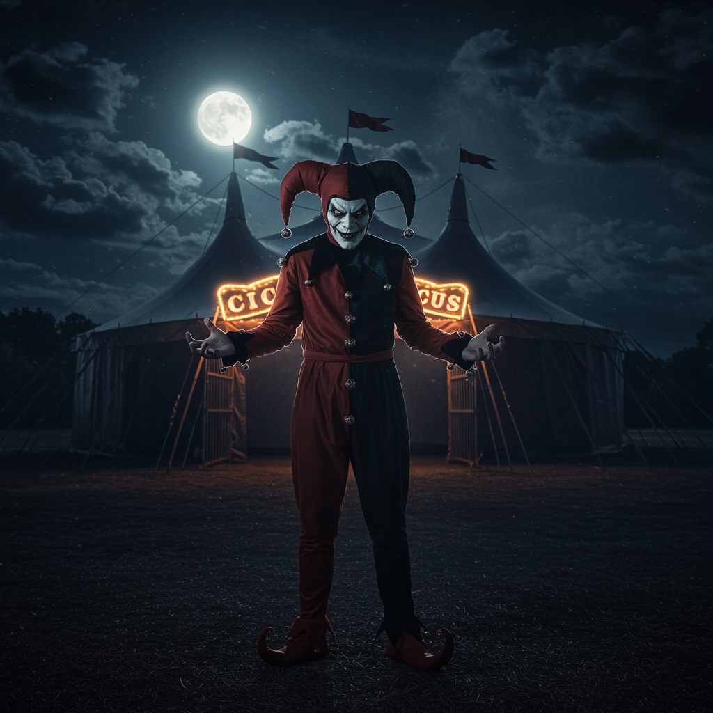 View this AI-generated image featuring a sinister jester standing ominously before the grand circus tent under the moonlit sky high resolution hyper realistic image expert photography with a dramatic perspective ethereal glow cast from behind casting eerie shadows. Created using advanced AI technolo