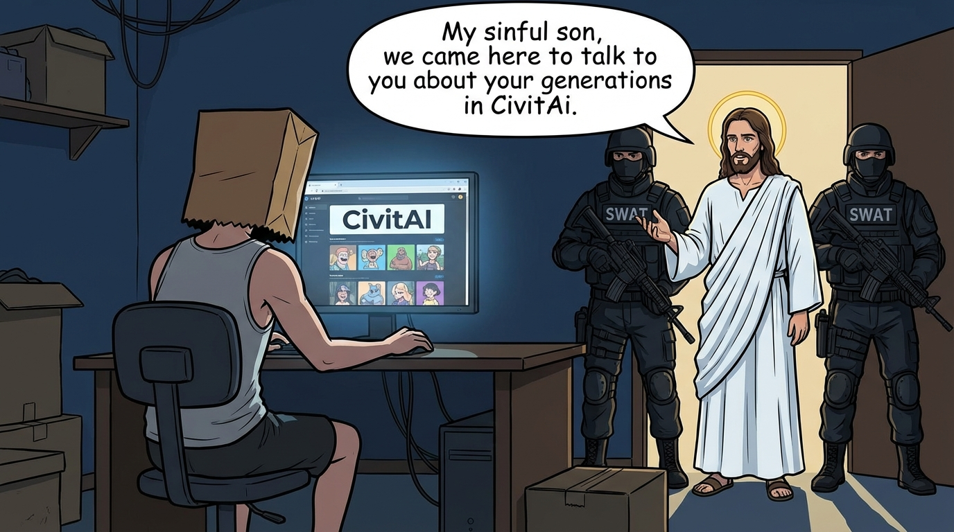 A humorous cartoon depicts Jesus Christ, flanked by two SWAT officers, confronting a young man with a paper bag over his head, who is engrossed in a CivitAI webpage. The scene is dimly lit, adding to the comedic tension of the unexpected intervention.