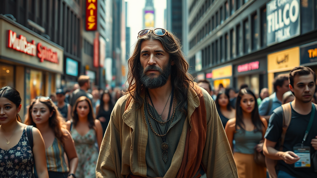 Jesus dressed in bohemian attire meandering through bustling New York City streets, surrounded by a mix of curious and indifferent pedestrians, captured in vivid cinematic detail with ultraphotorealistic clarity, vibrant colors, and stunning HDR quality in 8k resolution.
