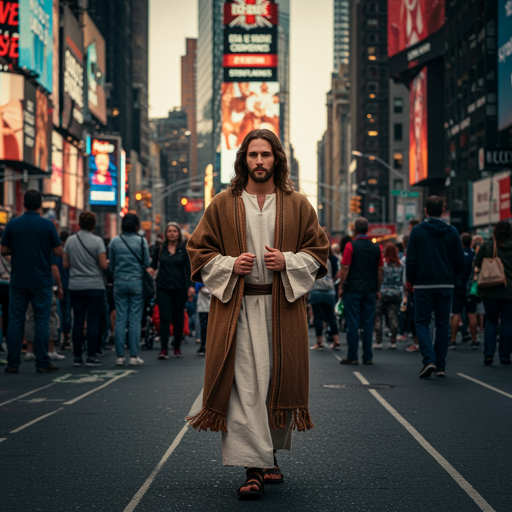 Jesus dressed in bohemian attire strolling through the bustling streets of New York City, surrounded by real people going about their day, captured in a cinematic, ultraphotorealistic style with vivid details and depth, vibrant HDR colors, and stunning 8k resolution.