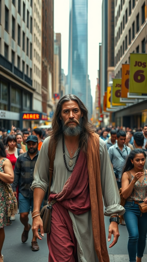 Jesus dressed in bohemian attire strolls through the bustling streets of New York City, surrounded by diverse and lively crowds, capturing a cinematic scene with ultraphotorealistic detail in vivid 8k HDR resolution.